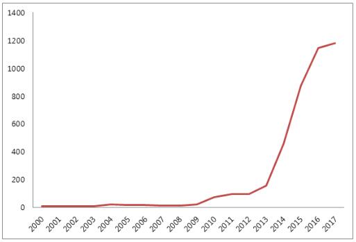 根據韓國特許廳的數據顯示,截止至2012年,IoT服務相關的專利申請量年均不到100件,而在2017年的申請量驟增11倍,達到了1179件。