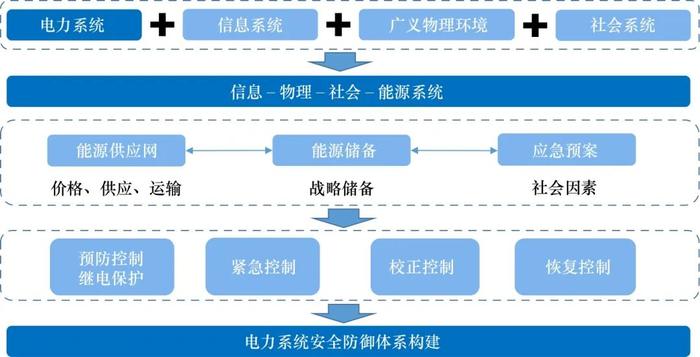 在信息物理社會系統框架方面,采用機理分析和沙盤推演手段,開展極端事件、綜合能源、政策機制、規劃運行的“時 ? 空 ? 物”要素分析;研究不確定性因素對能源 ? 電力可靠性及經濟性的影響規律,構建覆蓋電力系統運行過程,具有多類目標、多道防線能力的電力安全主動防御體系。