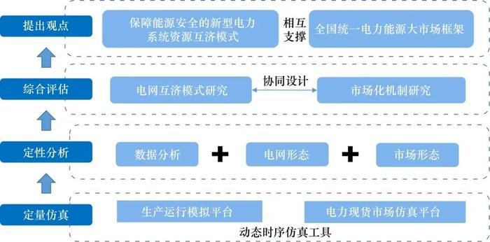 在資源配置模式方面,采取定量仿真、定性分析、綜合評估等方式,根據生產運行模擬平臺、電力現貨市場仿真平臺的結果,融合電網形態及市場形態數據分析,論證形成新型能源體系下電網互濟模式及相應的市場支撐機制,從而構建新型電力系統資源互濟模式、全國統一電力能源大市場框架相互支撐的大范圍共享互濟體系。