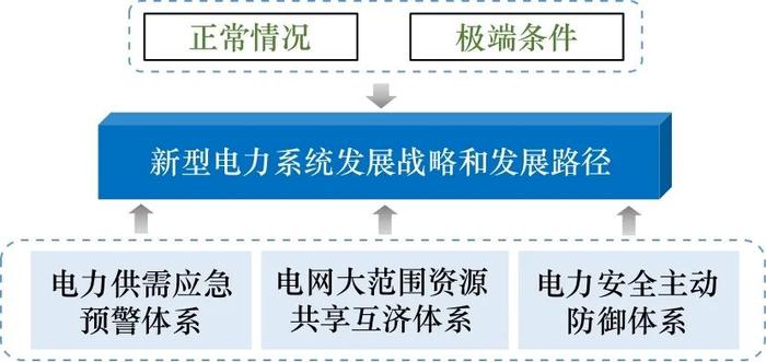 新型電力系統安全性的提升,需要不同領域的科技進步以及交叉融合,也離不開電力系統具體業務工作(如規劃、運行、交易、政策)的豐富實踐。從電力安全供應、電網安全運行維度著手,將極端天氣納入電力系統規劃與安全運行的范圍,開展包括正常情況和極端條件在內的多情景分析。以常態情景下的“長久安全”、極端情景下的“自主可控”為目標,綜合極端天氣電力供需應急預警、電網大范圍資源共享互濟、跨能源電力安全主動防御以及相應的支撐體系,形成能源安全格局下新型電力系統發展戰略路徑(見圖7)。