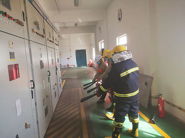此次演練場景設置為模擬SVG連接變壓器341高壓開關柜著火,共場景11個。在總指揮交代運行方式、應急組組長進行安全交底后,隨著生產樓辦公區域傳出刺耳的火警警報聲,演練正式開始。煙感報警裝置發現火情,應急組長立即派人就地檢查發現341高壓開關柜下部冒出濃煙,判斷為開關出線電纜接頭放炮引起,隨即組織現場滅火、匯報集控中心和調度、撥打火警電話、啟動防火應急響應等一系列應急措施迅速展開,全體參演人員穿上戰斗服,手提二氧化碳滅火器,迅速向開關柜內噴入滅火劑,經過數分鐘的撲救,在消防隊到來前將火撲滅,應急組配合消防隊人員檢查現場是否有復燃可能,總指揮宣布解除應急響應,演練結束。