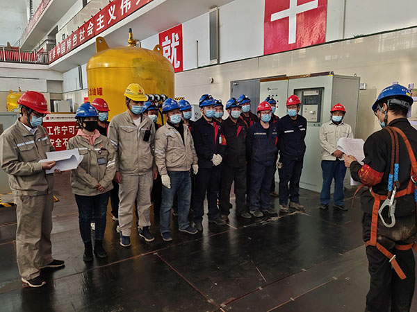 拆除工作開始前,專業(yè)人員、檢修人員、監(jiān)理人員三方按照編制的專項吊裝方案認真核對檢修措施,重點對主橋機供電系統(tǒng)、起升系統(tǒng)、吊具進行檢查。同時組織工作負責人和工作班成員現(xiàn)場開展三講一落實活動,著重對本次吊裝作業(yè)過程中存在的風險點和預控措施進行現(xiàn)場講解。燈泡頭拆除過程中,由于尺寸原因泡頭與定子基座把合螺栓松開后,未能按照預期直接放置到專用工具上。檢修指揮部現(xiàn)場研究方案,轉變思路,采用單側著力再逐步調整另一側的方案,把干涉區(qū)域盡量避開,整個拆除吊裝歷時5個小時順利完成。拆除吊運期間,該公司各級人員到位監(jiān)督,有效保障了安全措施齊全可靠。現(xiàn)場檢修人員充分發(fā)揚團結協(xié)作、不怕吃苦、奮勇拼搏的工作精神,本著精益求精的工作態(tài)度,嚴格執(zhí)行安全規(guī)程、檢修工藝和工序,確保了整個拆除工作萬無一失。