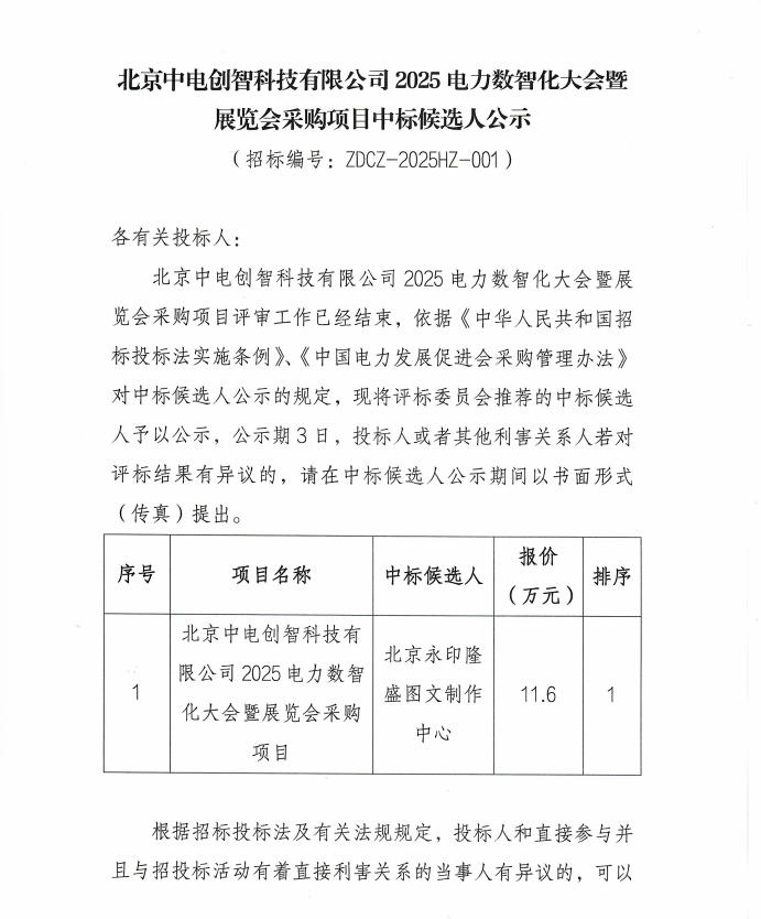 北京中電創智科技有限公司2025電力數智化大會暨展覽會采購項目中標候選人公示