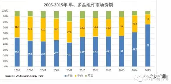 我們先來了解一些信息,圖一是05年到15年,單晶、多晶、薄膜等的市場份額變化,我們可以發(fā)現(xiàn),從09年到15年,單晶、薄膜等的市場份額是不斷降低的,而多晶則在15年實現(xiàn)了一個井噴。圖二是日本單晶市場份額的統(tǒng)計數(shù)據(jù),日本是一個國土面積十分有限的國家,對高效組件的需求應(yīng)該超過其他國家,可是