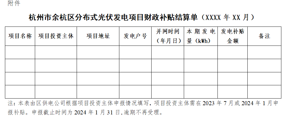 9月23日,余杭區發展和改革局公開征求《余杭區光伏綠色發展資金補貼辦法》(征求意見稿)意見的公告,文件指出,2022年1月1日至2022年12月31日期間,對通過并網驗收的單位和居民家庭屋頂分布式光伏發電項目,自驗收合格并網發電之日起,待其發電滿12個月后,按實際發電量給予0.1元/千瓦時的一次性資金補貼。為進一步推動我區光伏產業持續健康發展,推進節能減排和能源結構優化調整,根據《關于專題研究能耗“雙控”和迎峰度夏工作的會議紀要》(余政紀要〔2022〕19號)要求,經區政府同意,制定出臺《余杭區光伏綠色發展資金補貼辦法》(征求意見稿)。根據規范性文件制定程序,現向社會公開征求意見,請依據有關法律法規提出建議(請反饋至郵箱:qfgj@yuhang.gov.cn),并于10月9日前反饋至我局。附件:20220922余杭區光伏綠色發展資金補貼辦法.docx(征求意見稿)為進一步推動我區光伏產業持續健康發展,推進節能減排和能源結構優化調整,根據《關于專題研究能耗“雙控”和迎峰度夏工作的會議紀要》(余政紀要〔2022〕19號)要求,經區政府同意,制定出臺《余杭區光伏綠色發展資金補貼辦法》,具體內容如下:1.在杭州市余杭區范圍內新建的單位屋頂分布式光伏發電項目(不含國有產權的公共機構建筑光伏發電項目)的投資主體。2.2022年1月1日至2022年12月31日期間內建成,且通過光伏項目備案、并網驗收的光伏發電項目。1.在杭州市余杭區域內新建的居民家庭屋頂分布式光伏發電項目的項目投資主體。2.2022年1月1日至2022年12月31日期間建成,且通過并網驗收的光伏發電項目。2022年1月1日至2022年12月31日期間,對通過并網驗收的單位和居民家庭屋頂分布式光伏發電項目,自驗收合格并網發電之日起,待其發電滿12個月后,按實際發電量給予0.1元/千瓦時的一次性資金補貼。2. 申請補貼的項目應提交財政補貼申請表、項目備案表、項目并網驗收意見、區供電公司出具的并網發電量證明等材料。3. 區供電公司按要求填寫《杭州市余杭區分布式光伏發電項目財政補貼結算單》(附件),簽署意見并加蓋公章后報送區發改局;經區發改局審核,區財政局復核、公示并報區政府審批同意,向項目投資主體撥付地方財政補貼資金。4. 補貼資金每半年申報一次。項目投資主體可選擇于2023年7月或2024年1月向區供電部門提出申報。申報截止時間為2024年1月31日,逾期不再受理。申報成功者,不再重復受理。1. 區發改局負責政策績效目標管理、績效跟蹤和績效評價,會同區財政局等部門對享受資金補貼項目進行抽查。對未通過審核的項目,將視情況暫緩或停止對項目的資金補貼。2. 分布式光伏發電項目發生以下情形的,將取消本區光伏發電財政資金補貼。2)項目建成使用過程中出現違反光伏發電項目安裝規范或存在重大安全隱患。3. 專項資金必須專款專用,任何單位不得截留、挪用。對弄虛作假、冒領或者截留、挪用、滯留資金的,一經查實,將收回資金,并按有關規定進行處理。附件:杭州市余杭區分布式光伏發電項目財政補貼結算單