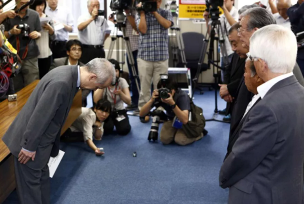 2013年8月29日,在日本東京,日本東京電力公司社長廣瀨直己(左)向全國漁業協會聯合會的代表鞠躬道歉。日本福島第一核電站先前曝出儲水罐放射性污水大量泄漏事件,引發日本漁業團體擔憂和抗議。新華社/法新