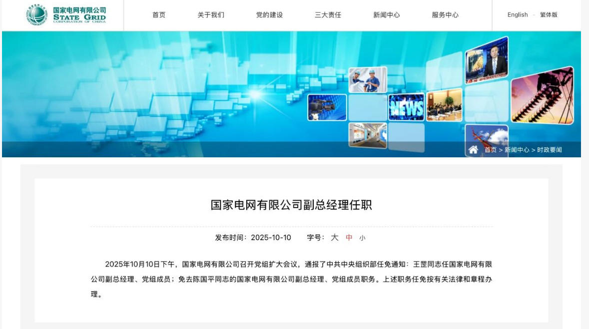 2025年10月10日下午,國家電網有限公司召開黨組擴大會議,通報了中共中央組織部任免通知:王罡同志任國家電網有限公司副總經理、黨組成員;免去陳國平同志的國家電網有限公司副總經理、黨組成員職務。上述職務任免按有關法律和章程辦理。