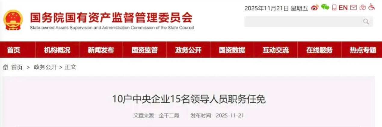 國務院國資委網站11月21日消息,10戶中央企業15名領導人員職務任免。