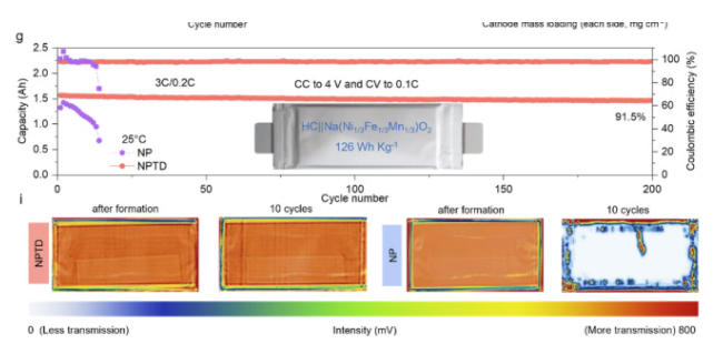 鈉電領(lǐng)域標(biāo)志性成果:北航王華團(tuán)隊實現(xiàn)鈉電軟包常溫3C快充,-20°C下0.5C充電,通過超聲成像技術(shù)分析結(jié)果進(jìn)一步證實了3C快充的安時級鈉離子軟包電池的安全性及穩(wěn)定循環(huán)。