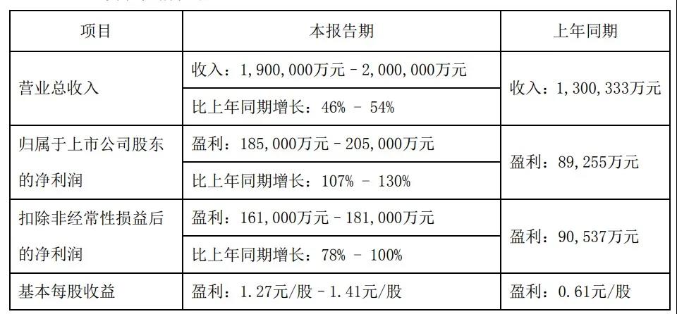圖:陽光電源2020年業(yè)績預告情況表