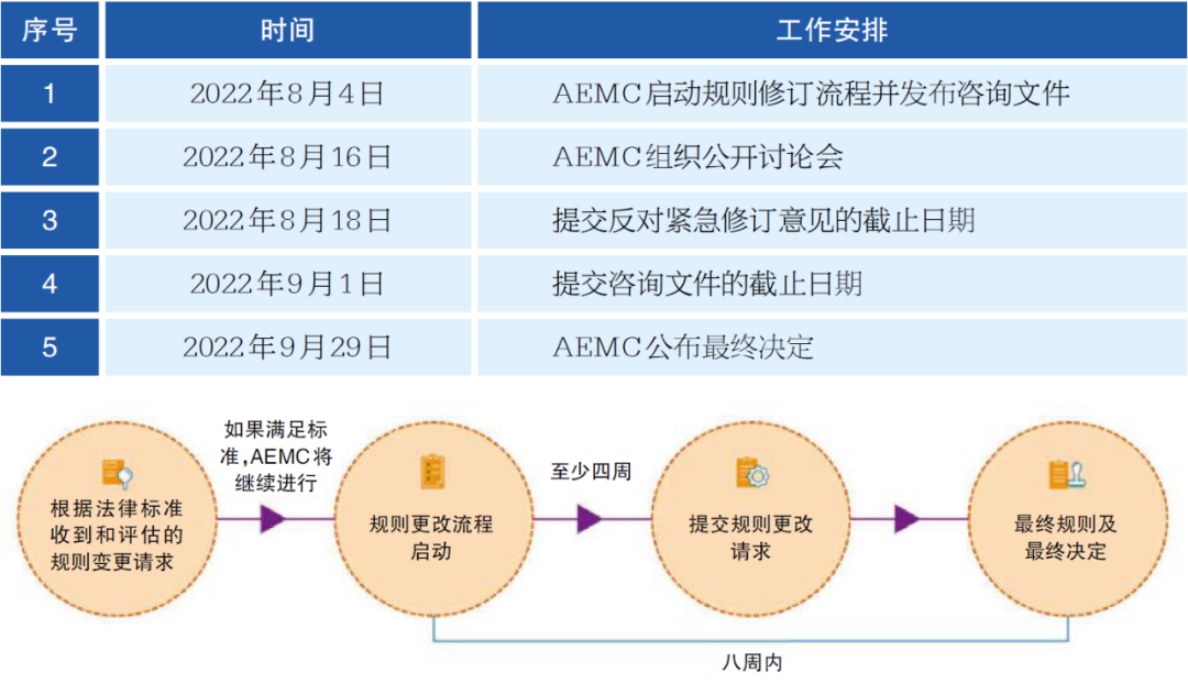 7月21日,AEMC發布《啟動和加快修訂APC規則修訂意向的預先通知》。8月4日,AEMC啟動了APC規則緊急修訂流程,公開發布咨詢文件以便利益相關者參與其中。按照法律規定,緊急修訂流程下只有一輪咨詢,并且AEMC必須在規則修訂流程開始后的八周內(最晚9月29日)公布其最終決定。