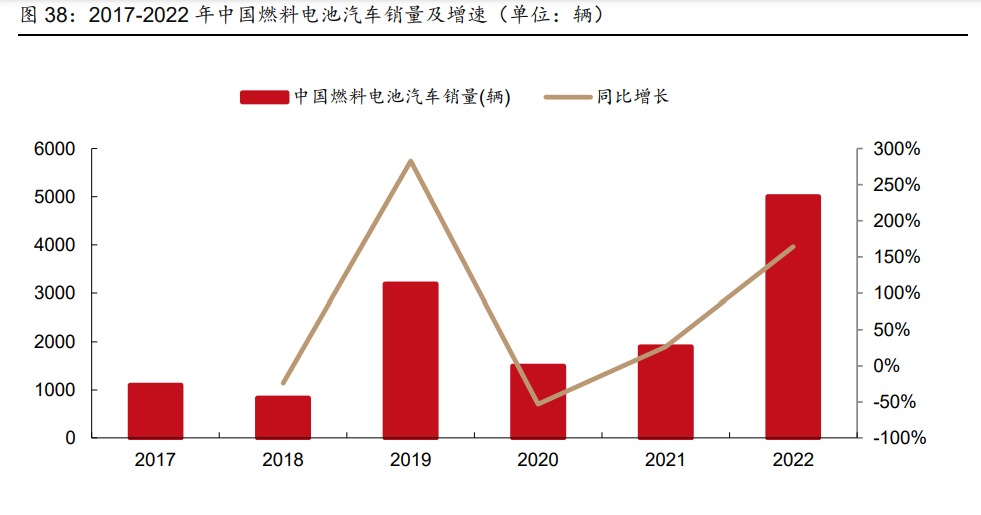中國(guó)燃料電池汽車(chē)銷(xiāo)量增速明顯,商用車(chē)占據(jù)主導(dǎo)地位。2016-2019 年我國(guó)燃料電池汽 車(chē)銷(xiāo)量持續(xù)增長(zhǎng),2020 年受疫情和補(bǔ)貼政策退坡等因素的影響,燃料電池汽車(chē)銷(xiāo)量出現(xiàn) 下降,而在 2021 年燃料電池汽車(chē)銷(xiāo)量恢復(fù)增長(zhǎng),到 2022 年底,我國(guó)燃料電池汽車(chē)銷(xiāo)量 達(dá)到 5006 輛,同比增長(zhǎng) 164.17%。國(guó)內(nèi)燃料電池汽車(chē)保有量持續(xù)增長(zhǎng),2022 年達(dá)到 12306 輛,同比增長(zhǎng) 37.68%。根據(jù)《中國(guó)氫能產(chǎn)業(yè)發(fā)展報(bào)告 2022》,預(yù)計(jì)至 2025 年,中國(guó)燃料 電池汽車(chē)保有量將發(fā)展到 5-10 萬(wàn)輛,預(yù)計(jì)至 2030 年,燃料電池汽車(chē)將實(shí)現(xiàn)商業(yè)化運(yùn)營(yíng)。 從車(chē)型類別來(lái)看,2022 年,我國(guó)燃料電池汽車(chē)銷(xiāo)量中,商用車(chē)占據(jù)主導(dǎo)地位,乘用車(chē)占比 僅為 4.47%。根據(jù)國(guó)際能源署統(tǒng)計(jì)數(shù)據(jù),在國(guó)內(nèi)燃料電池客車(chē)和商用車(chē)政策推動(dòng)下,我國(guó) 在全球燃料電池公交車(chē)和商用車(chē)領(lǐng)域中占據(jù)主導(dǎo)地位。