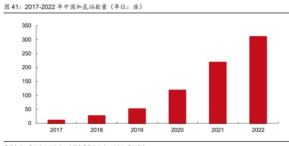 加氫站布局加快,逐漸形成網(wǎng)絡(luò)。加氫站等基礎(chǔ)設(shè)施是否完善是影響消費(fèi)者購(gòu)買(mǎi)氫燃料電 池汽車(chē)熱情的主要因素。隨著國(guó)內(nèi)氫燃料電池汽車(chē)?yán)塾?jì)銷(xiāo)量增加,中石化、中石油等能源 央企不斷加大加氫基礎(chǔ)設(shè)施的投資和建設(shè)力度,國(guó)內(nèi)加氫站數(shù)量呈現(xiàn)快速增長(zhǎng)趨勢(shì)。截至 2022 年底,我國(guó)加氫站累計(jì)建成數(shù)量達(dá)到 274 座。根據(jù) 2020 年中國(guó)汽車(chē)工程學(xué)會(huì)發(fā)布 的《節(jié)能與新能源汽車(chē)技術(shù)路線圖 2.0》相關(guān)規(guī)劃,到 2035 年加氫站的建設(shè)目標(biāo)為至少 5000 座,中國(guó)未來(lái)加氫基礎(chǔ)設(shè)施的市場(chǎng)規(guī)模在 2030-2050 年將突破千億。此外,我國(guó)加 氫站建設(shè)參與主體呈現(xiàn)多樣化趨勢(shì),采取規(guī)模化建設(shè)或加油/加氫/加氣站合建等方式來(lái)拓 展加氫基礎(chǔ)設(shè)施網(wǎng)絡(luò),單位加注成本也有望下降。